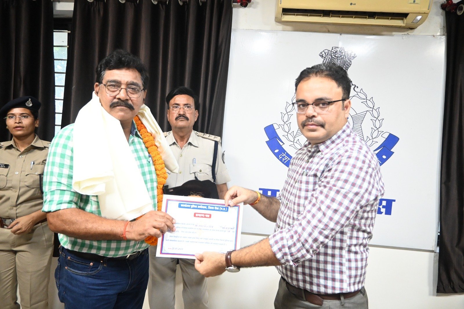 पुलिस अधीक्षक विवेक सिंह,अतिरिक्त पुलिस अधीक्षक अनिल सोनकर,नगरपुलिस अधीक्षक श्रीमती शिवाली चतुर्वेदी द्वारा सेवानृित्त अधिकारियों/ कर्मचारियों को श्रीफल, शाल भेट की एवं माल्यार्पण कर सम्मानित किया एवं उनके उज्जवल भविष्य की कामना की। इस दौरान एसडीओपी उदित मिश्रा,अजाक डीएसपी उमेश प्रजापति, रक्षित निरी० रीवा श्रीमती वंदना सिंह, सूबेदार अंजली गुप्ता एवं पुलिस लाईन में पदस्थ अधिकारी कर्मचारी उपस्थित रहे।
