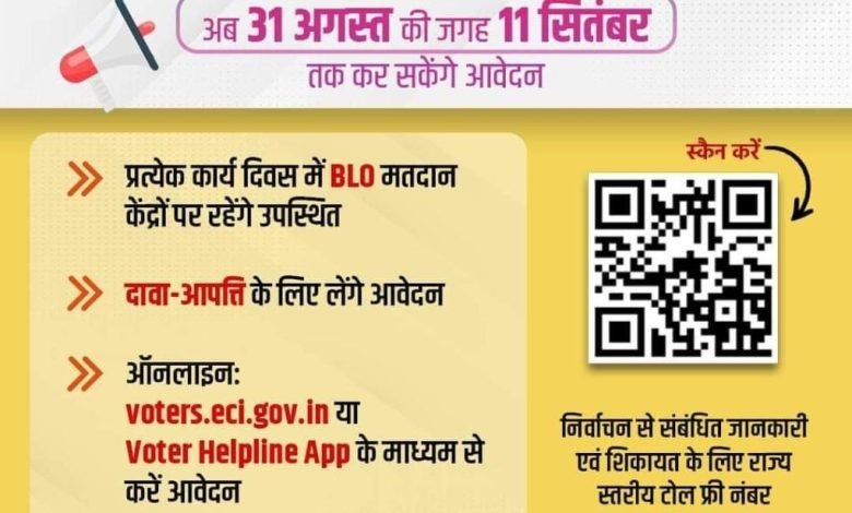 मध्य प्रदेश जिला सतना में 30 अगस्त 2023/भारत निर्वाचन आयोग ने मुख्य निर्वाचन पदाधिकारी मध्यप्रदेश भोपाल के अनुरोध पर मध्यप्रदेश में मतदाता सूची के चल रहे संक्षिप्त विशेष पुनरीक्षण कार्य में दावा-आपत्तियां प्राप्त करने की समय सीमा 31 अगस्त से बढ़कर 11 सितंबर 2023 कर दी है।