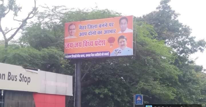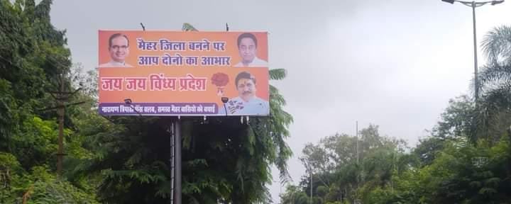 भोपाल — मैहर जिला बनते ही,मैहर विधायक दोनों ही पार्टी के प्रदेश के मुखिया की भोपाल शहर में फोटो लगवा कर होडिंग लगवाया गया, वहीं विधायक ये बता रहे हैं की कमलनाथ सरकार ने मेरे कहने पर मैहर जिला को केबिनेट में पास करवाया व मुख्यमंत्री शिवराज सिंह चौहान ने भी मैहर को दुबारा जिला बनाया,इसलिए दोनो सहाब बधाई के पात्र हैं,