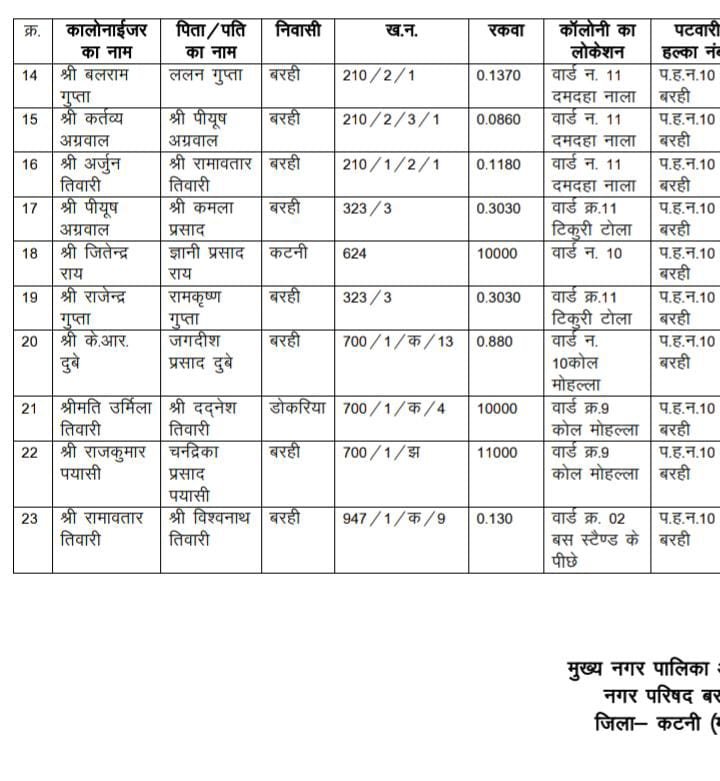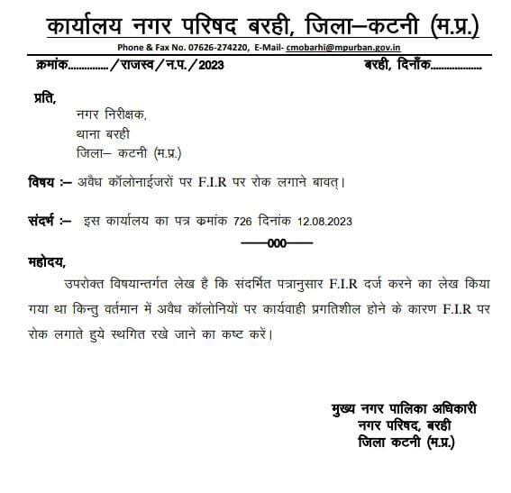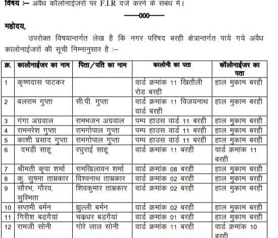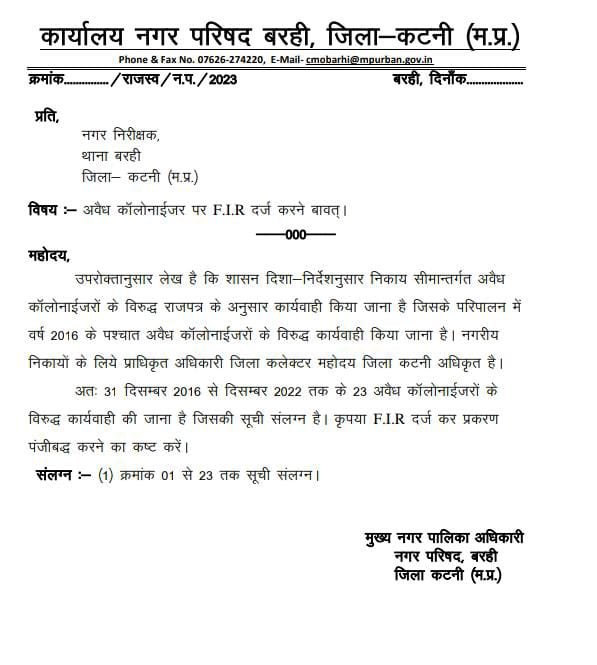 कलेक्टर द्वारा जिले के शहरी एवं ग्रामीण क्षेत्र में वर्ष 2016से 2023 तक की अवैध कालोनी चिन्हित कर स्थानीय प्रशासन द्वारा एफआई आर दर्ज कराने के आदेश दिए गए हैं, जिसके पालन में बरही नगर परिषद के सीएमओ ने बरही के 23 अवैध कालोनाइजरों के विरुद्ध एफआईआर दर्ज करने के लिए अगस्त माह में आवेदन के साथ सूची भेजा था।