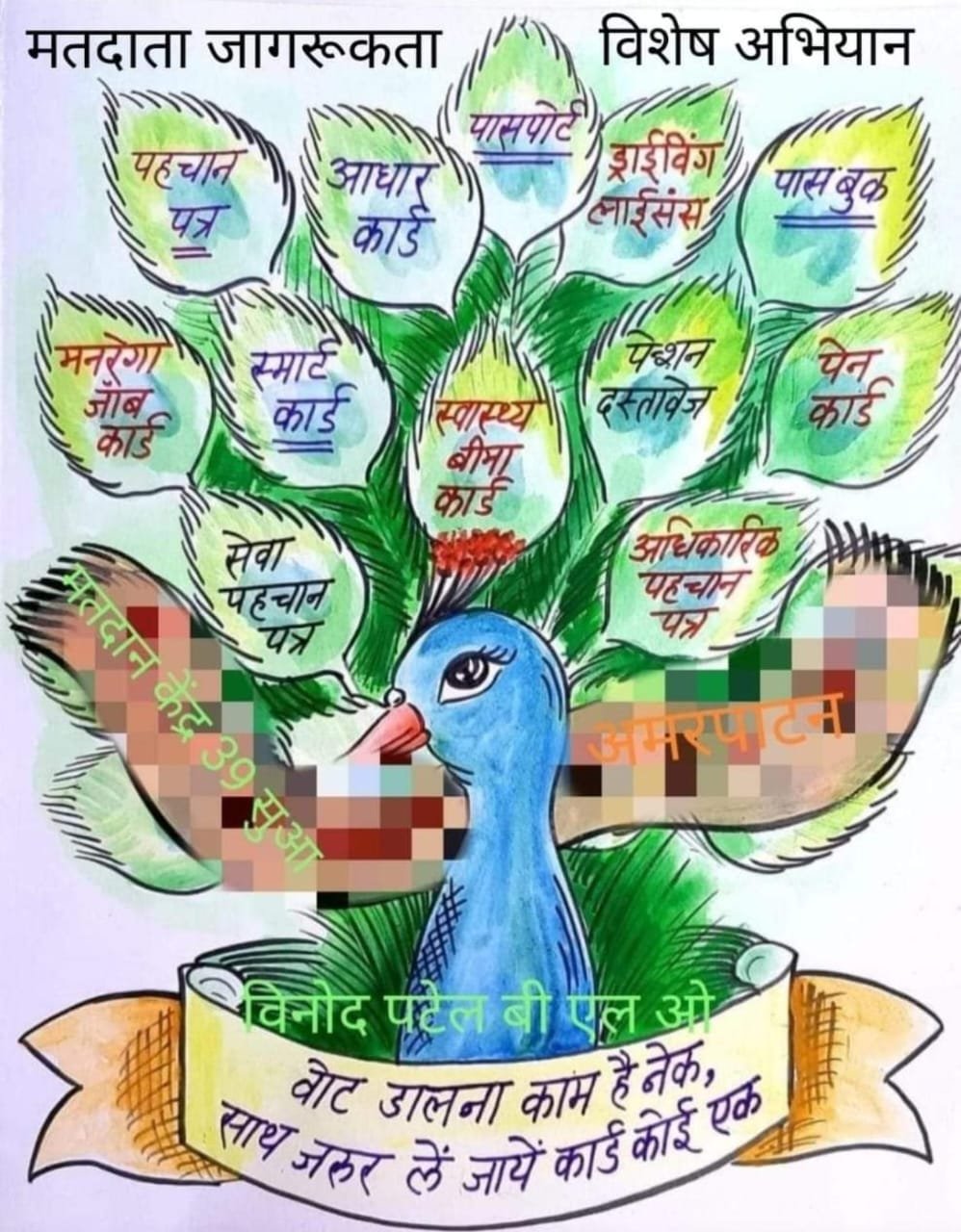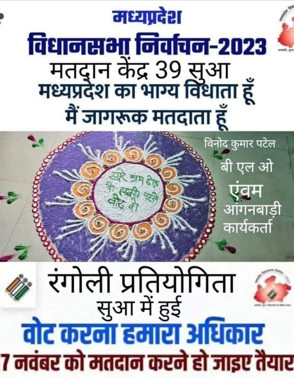 अमरपाटन विधानसभा क्षेत्र के अंतर्गत सुआ, लालपुर में आंगनवाडी कार्यकर्ताओं द्वारा बीएलओं के माध्यम से वोट करना हमारा अधिकार रंगोली प्रतियोगिता आयोजित कर 17 नवम्बर को मतदान करने के लिए प्रेरित किया। अमरपाटन के बीएलओ विनोद पटेल द्वारा मतदाता जागरूकता के विशेष अभियान में मतदाता की पहचान के संबंधित दस्तावेजों के बारे में रंगीन पोस्टर तैयार कर प्रदर्शित किया।