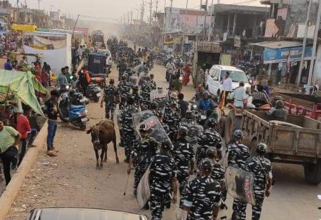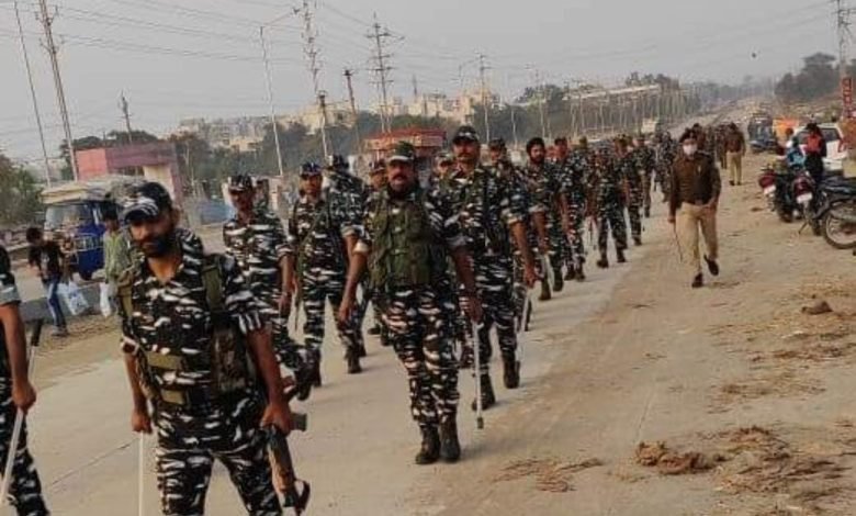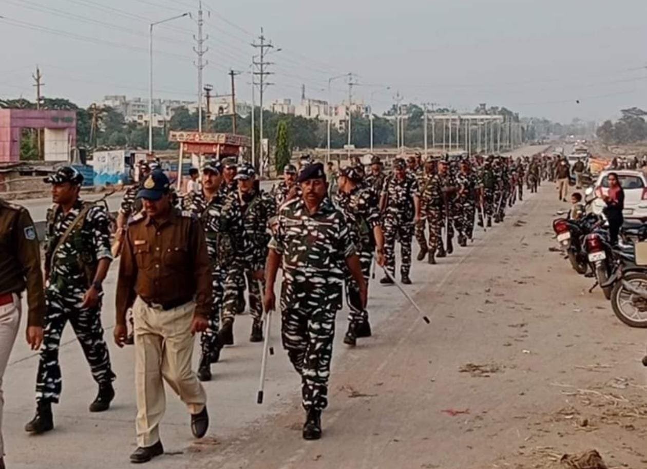पालन में श्री सुंदर सिंह कनेश पुलिस उपायुक्त जोन 04 भोपाल , श्री मलकीत सिंह अति. पुलिस उपायुक्त जोन 04 भोपाल एवं श्रीमती अंजली रघुवंशी सहा. पुलिस आयुक्त चूनाभट्टी संभाग के कुशल मार्ग निर्देशन मे आज दिनांक आज दिनाँक 10/11/2023 को थाना कोलार रोड भोपाल क्षेत्रांतर्गत कंट्रोल रूम से प्राप्त सीआरपीएफ जी/167 एवं ई/184 कंपनी के कुल 110 जवानो के थाना प्रभारी कोलार श्री आषुतोष उपाध्याय थाने के बल के साथ में थाना क्षेत्र के संवेदनशील मतदान केन्द्र व वल्नरेवल क्षेत्रो में पैदल एवं वाहनो से फ्लेगमार्च निकाला गया जो थाने से प्रारंभ होकर डी मार्ट होते हुये