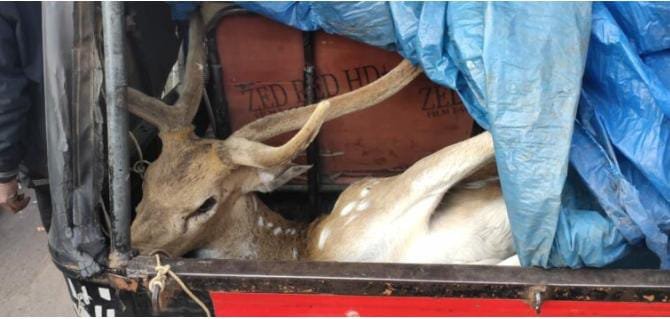 पुलिस का सराहनीय कार्य चेकिंग के दौरान वाहन में मिला हिरण का शव, जगन्नाथ चौराहे मे हुई कार्यवाही