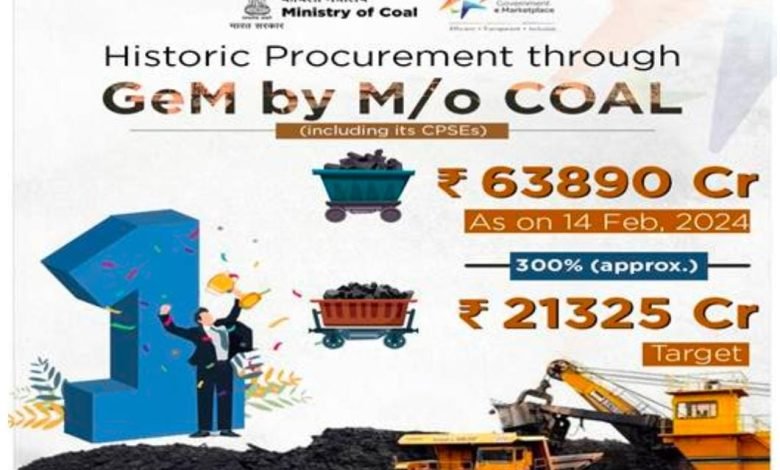 कोयला मंत्रालय खरीद के मामले में वित्तीय वर्ष 2023-24 के लिए अपने लक्ष्य को पार कर गया है। 14 फरवरी, 2024 तक जेम के माध्यम से खरीद 63,890 करोड़ रुपये तक बढ़ गई है।