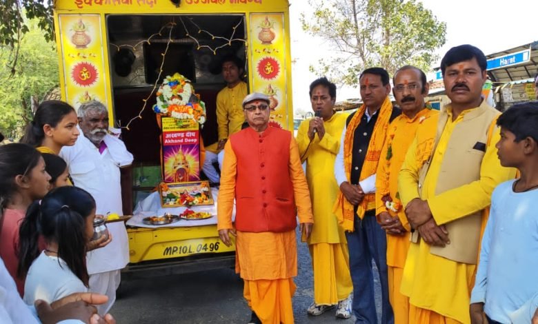 मध्य प्रदेश जिला दमोह तहसील हटा अखंड दीप एवं मातृशक्ति जन्मशताब्दी ग्राम तीर्थ श्रद्धा संवर्धन यात्रा जनपद पंचायत बटियागढ़ की 59 ग्राम पंचायतो के लिए दिनांक 1 मार्च 20 में24 को दमोह का शक्ति कलश हारट पंचायत पहुंचा जहां पर राम लाल पटेल,मोती लाल , सीताराम पटैल एवं ग्राम वासियों ने पुष्प वर्षा एवं आरती उतार कर स्वागत किया।
