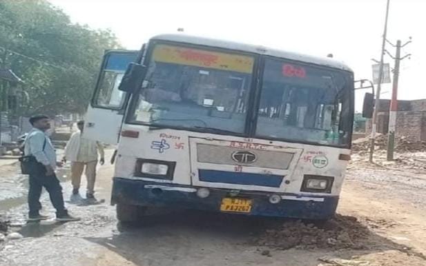 सवारियों से भरी रोडवेज बस फंसी गड्डे में,
