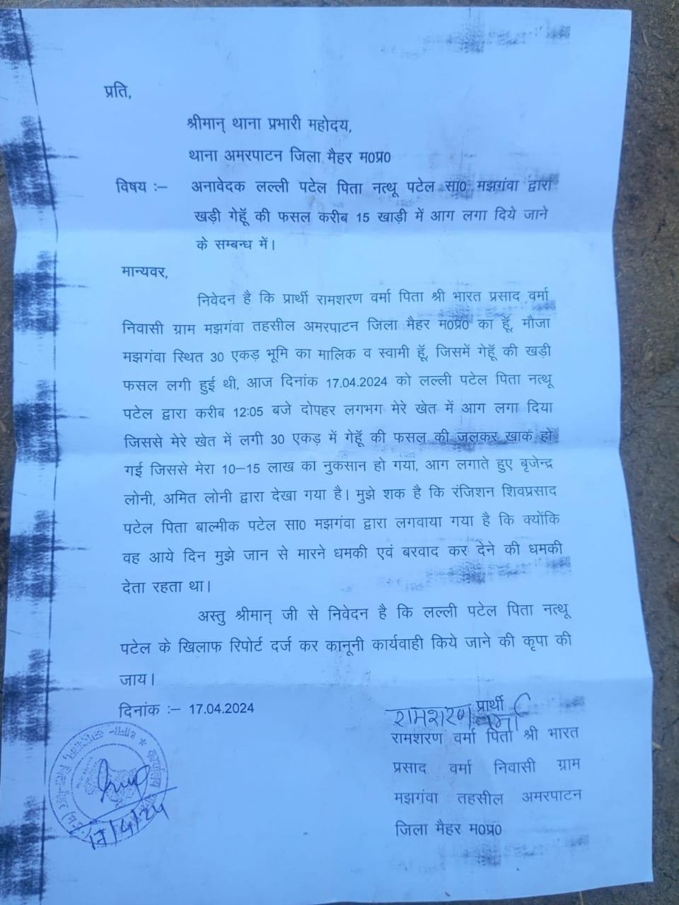 मझगवां पंचायत में किसान के खेत में जलन खोरों ने लगाई भीषण आग लगभग 35 एकड़ का गेहूं लॉक जलकर हुआ खाक पीड़ित ने लगाई पुलिस प्रशासन से लगाई न्याय की गुहार