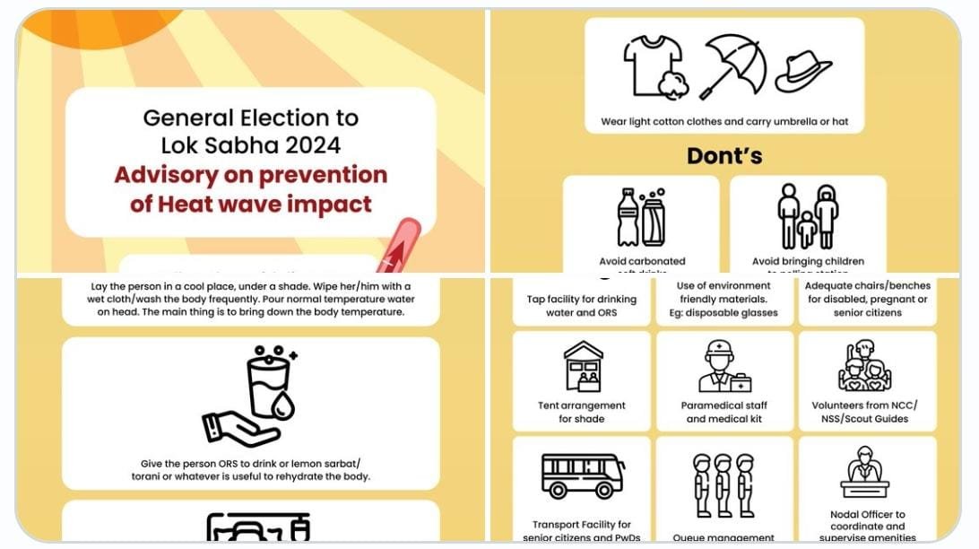 4. मतदान केन्द्र क्षेत्रों में गर्मी के प्रभाव को कम करने के लिए एहतियाती उपायों (क्या करें और क्या न करें) के लिए जनता के बीच आईईसी (सूचना, शिक्षा और संचार) गतिविधियां की जाएंगी।