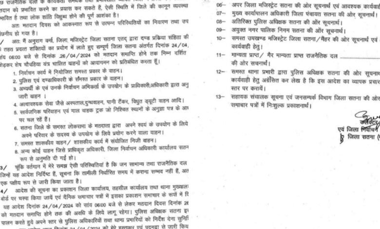 लोकसभा क्षेत्र सतना के संपूर्ण क्षेत्र में मतदान समाप्ति से 48 घंटे पूर्व अर्थात् 24 अप्रैल की शाम 6 बजे से 26 अप्रैल को मतदान समाप्ति तक के लिये प्रतिबंधात्मक आदेश जारी किये हैं।