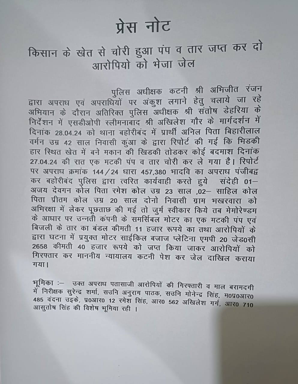 आज दिनांक 29.04.2024 को पुलिस अधीक्षक कटनी श्री अभिजीत रंजन द्वारा स्वयं संज्ञान लेते हुए