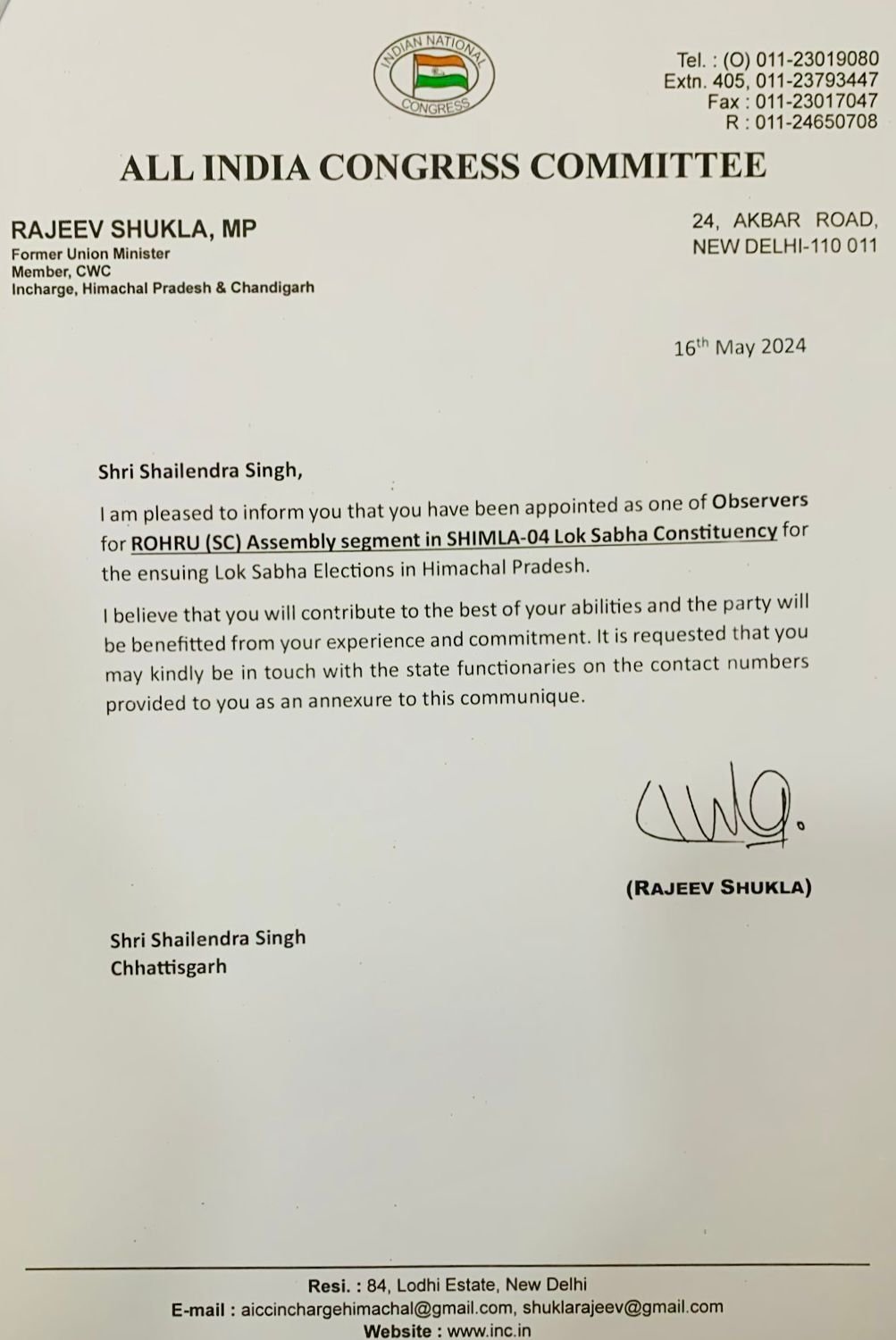 हिमाचल प्रदेश के शिमला लोकसभा का रोहरु विधानसभा प्रभारी बना कर लोकसभा चुनाव के लिए महत्वपूर्ण जिम्मेदारी दी गई ,