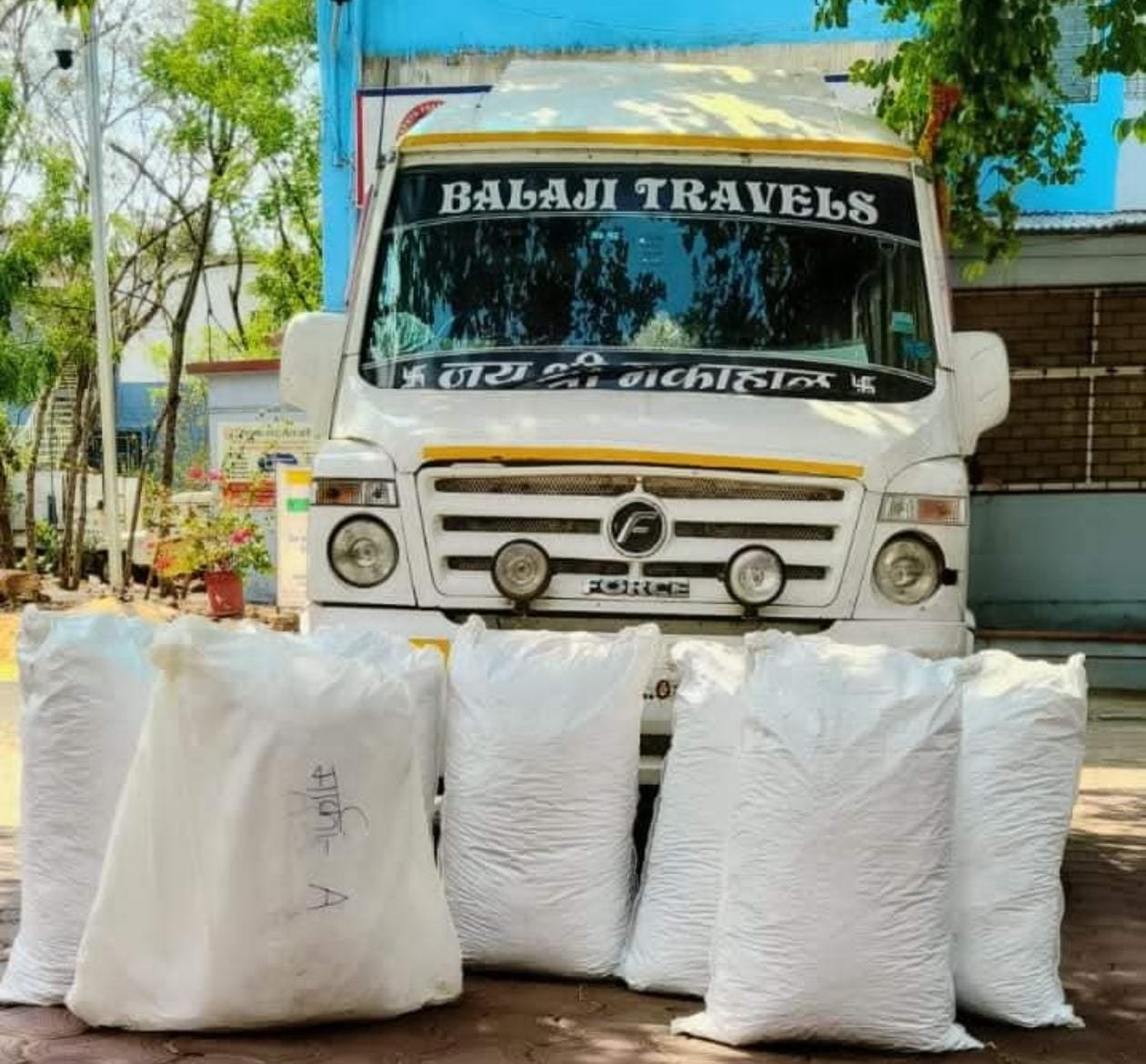 आरोपीगण 1.मोह.उबेश 2.रितेश प्रजापति 3. सतीश राजपूत व 4. गोपाल सिंह यादव के कब्जे से ट्रेवलर गाडी से मिले मादक पदार्थ गांजा जिसको पृथक पृथक 07 बोरियों व एक चादर की पोटली में रखा गया है