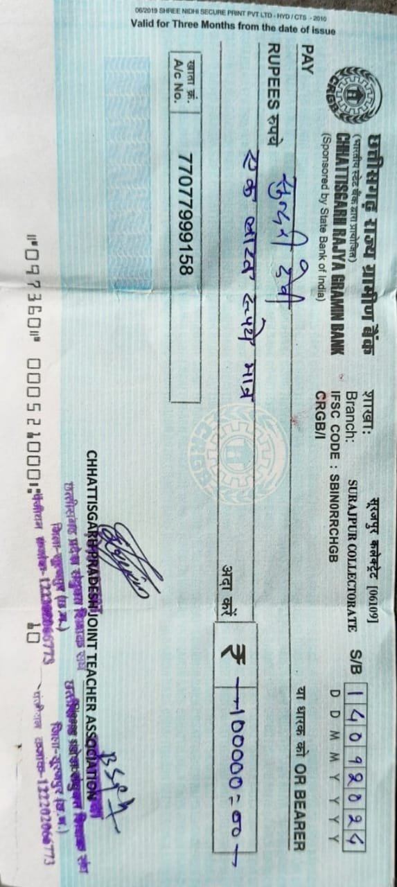 संयुक्त संवेदना योजनांतर्गत विकासखंड भैयाथान के शासकीय प्राथमिक शाला खुटरापारा में पदस्थ सहायक शिक्षक स्वर्गीय महेश प्रसाद काशी की धर्म पत्नी श्रीमती सुंदरी देवी को संयुक्त संवेदना समिति जिला सूरजपुर के तत्वाधान में संचालित संयुक्त संवेदना राशि की एक लाख रुपए का चेक ब्लॉक संचालक भैयाथान सुरेन्द्र दुबे के नेतृत्व में दिवंगत शिक्षक के गृह ग्राम बांसापारा गंगोटी में जाकर प्रदान किया गया ।