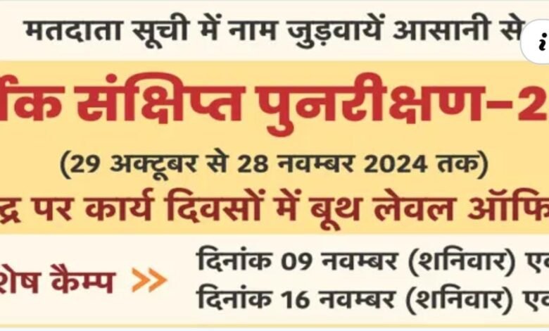 आयोग द्वारा विशेष अभियान की तिथि 09 नवम्बर 2024 शनिवार, 10 नवम्बर 2024 रविवार, 16 नवम्बर 2024 शनिवार एवं 17 नवम्बर 2024 रविवार को निर्धारित की गई है।