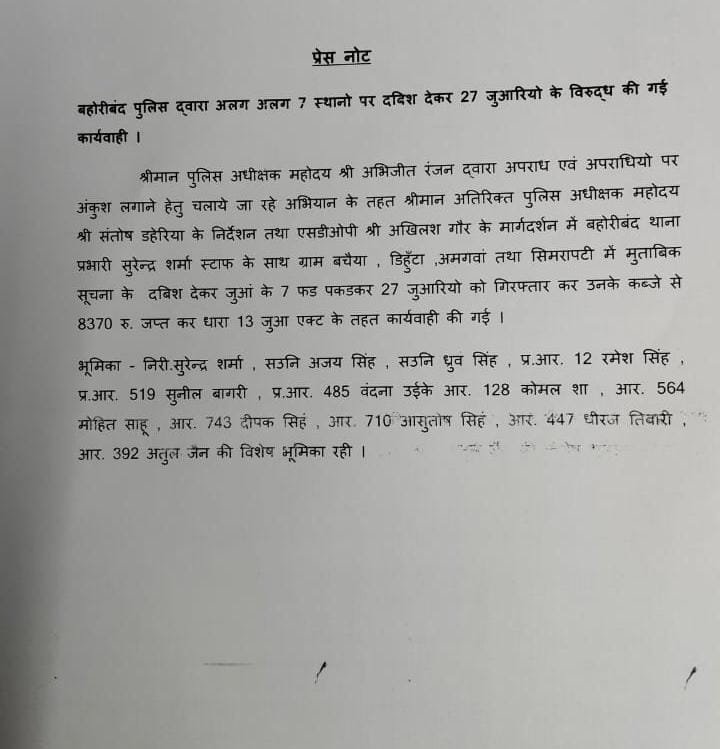 श्रीमान पुलिस अधीक्षक महोदय अभिजीत कुमार रंजन (भा.पु.से.) द्वारा दीपावली के त्यौहार के दौरान विशेष सतर्कता बरतते हुए, जुआ खेलने वालों के विरूद्ध प्रभावी कार्यवाही किए जाने हेतु निर्देशित किया गया है।