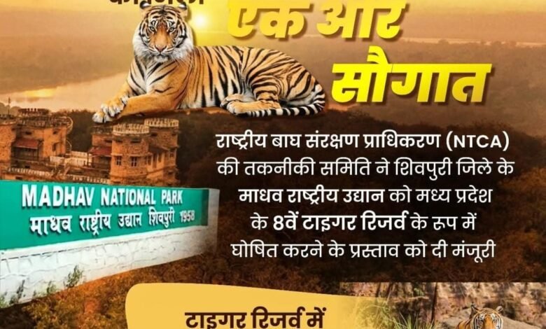 मध्य प्रदेश को राष्ट्रीय बाघ संरक्षण प्राधिकरण (NTCA) की तकनीकी समिति ने शिवपुरी जिले के माधव राष्ट्रीय उद्यान को मध्य प्रदेश के 8वें टाइगर रिजर्व के रूप में घोषित करने के प्रस्ताव को मंजूरी दी।