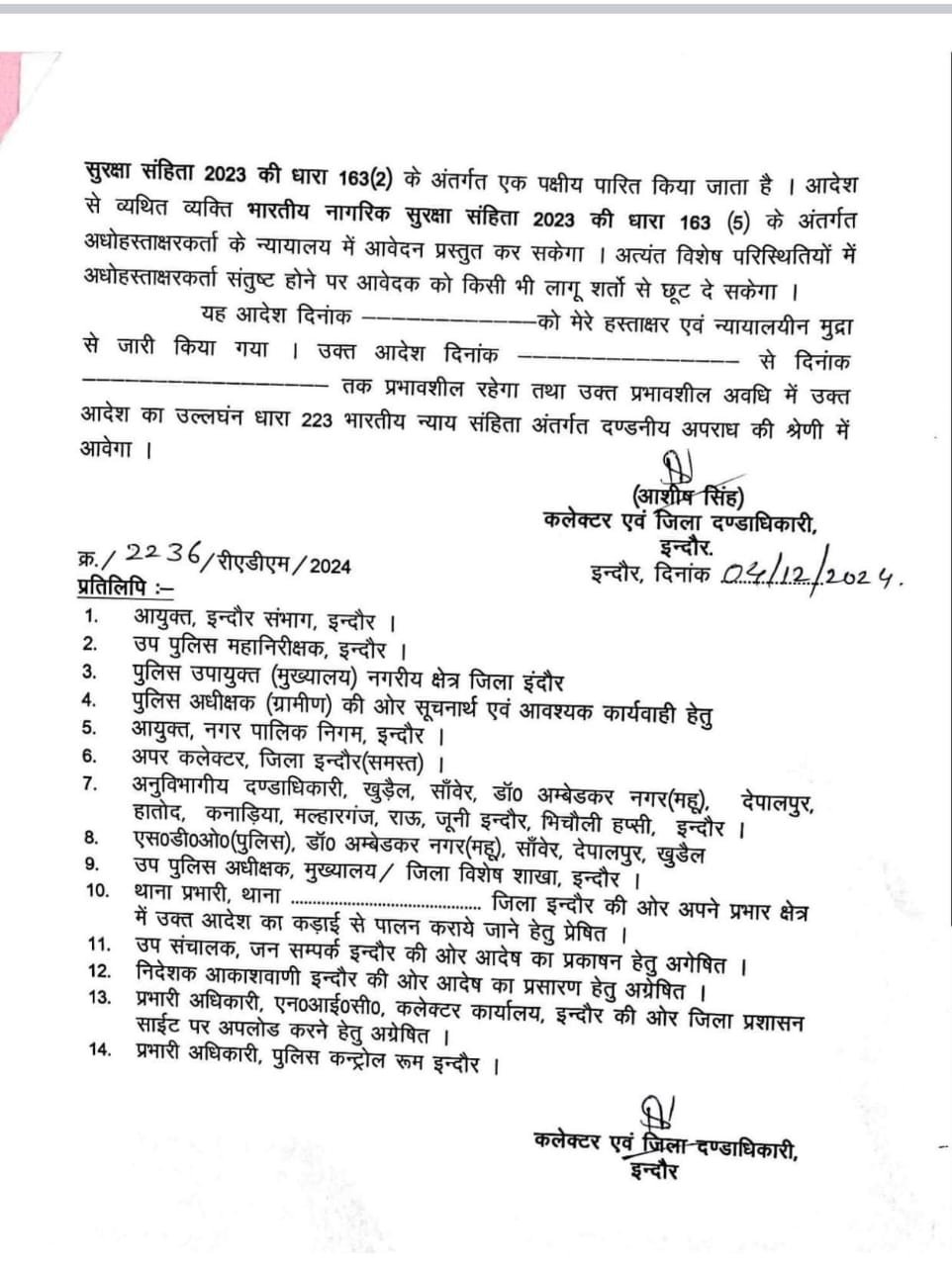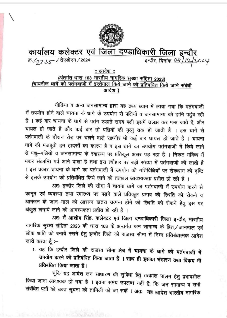 मध्य प्रदेश जिला जबलपुर कलेक्टर ने भारतीय नागरिक संहिता की धारा 163 के तहत चाइनीज़ धागे के पतंगबाजी में इस्तेमाल पर कलेक्टर एवं जिला दंडाधिकारी श्री आशीष सिंह द्वारा लगायी गई रोक।