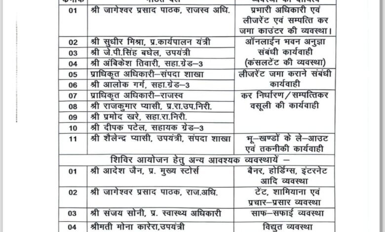श्री दुबे ने राजस्व अधिकारी जागेश्वर प्रसाद पाठक को प्रभारी अधिकारी बनाते हुए अन्य अधिकारियों को सभी आवश्यक व्यवस्थाओं हेतु विभिन्न दायित्व सौंपे है।